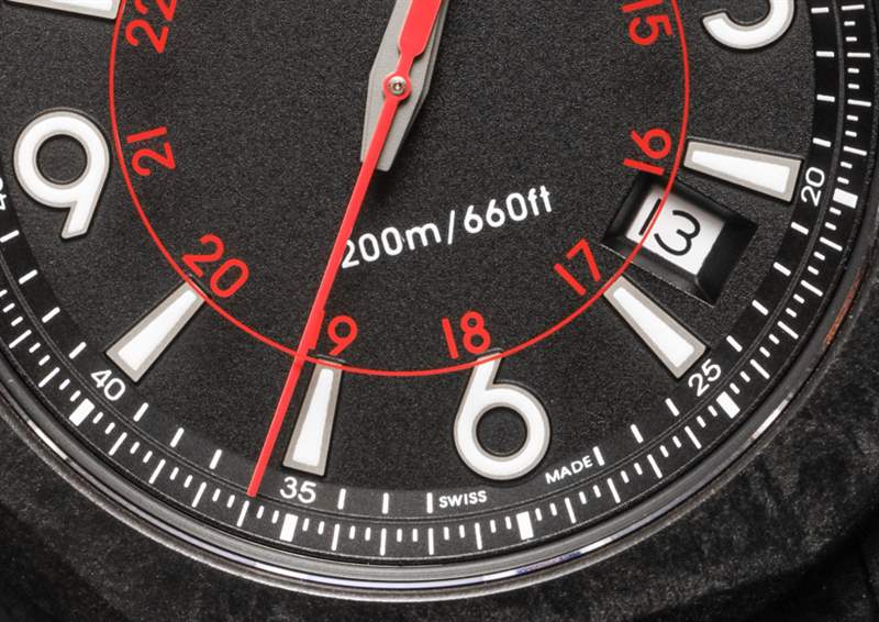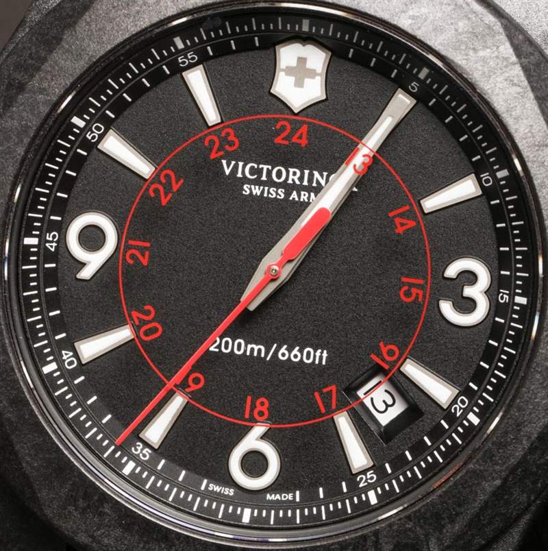 Luminant 既適用于迷人(且尺寸適中)的指針,也適用于時標。雙排較小增量的標記排列在法蘭環上。較低的用于秒針(我很高興地報告,我的 Victorinox Swiss Army INOX Carbon 有一個與標記完美對齊的秒針),而上面的只是為了風格 – 因為這些將用于計時碼表,并不是對這個運動有用的標記。這并不是真正的缺點,而只是計時純粹主義者會注意到的一個小怪癖。