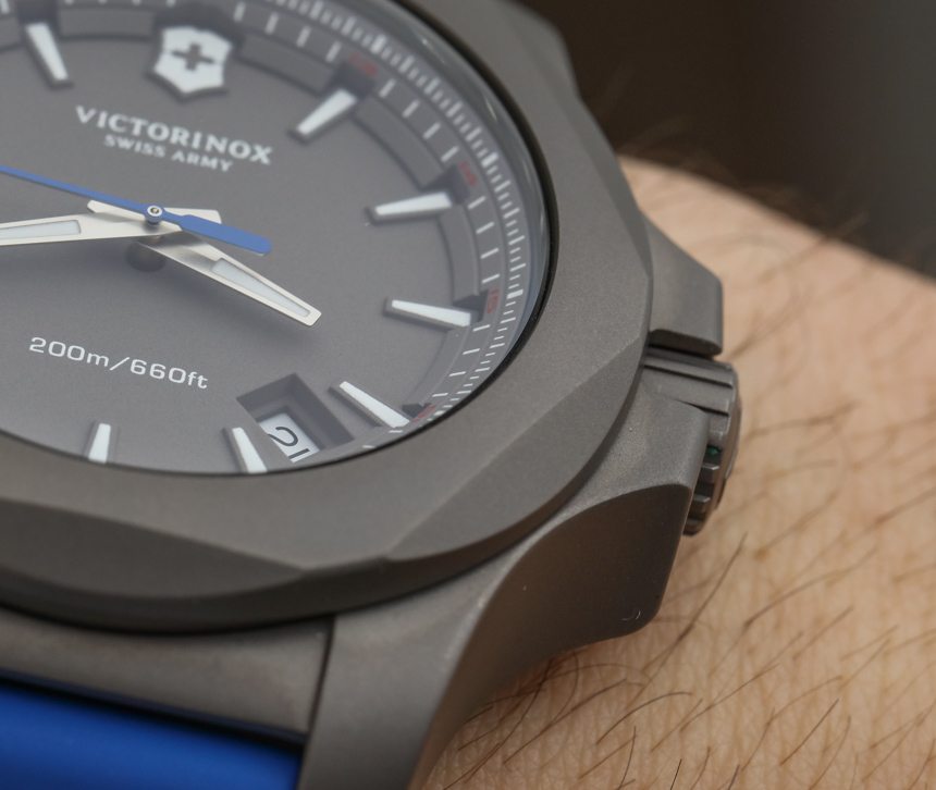 與標準 INOX 的拉絲和拋光鋼表殼不同,Victorinox Swiss Army 采用全噴砂處理鈦金屬表殼。我有一種感覺,這是 2 級和 5 級鈦金屬,這實際上很有趣,因為 INOX 式表殼的清晰角度和精確曲線做得非常好。與鋼相比,鈦的灰色外觀也在設計中得到了強調。此外,表殼的啞光處理流向表盤,為這款生活方式運動手表帶來更加清醒、工具風格的外觀。