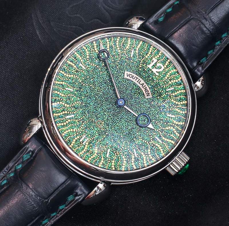 這不是Kari Voutilainen第一次與日本國寶和傳奇漆器藝術家 Kitamura Tatsuo(也稱為“Unryuan”)合作。Kitamura 的工藝品有多種不同的形式,當他與 Voutilainen 合作時,通常是精心手工組裝的馬賽克表盤,這些表盤結合了黃金和軟體動物貝殼等一系列自然元素和材料。這款手表叫做 Voutilainen 28 Hisui,在日語中是玉的意思,看看 Voutilainen 28 Hisui 的表盤顏色,就很容易看出原因了。