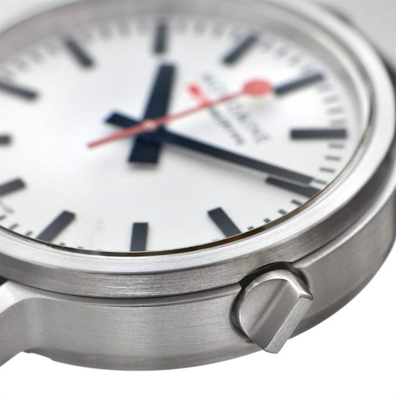 對我來說,這是 Stop2Go 時計最好的部分。機芯很有趣,但新的表殼設計非常好。精鋼材質的拉絲表殼寬 41 毫米,與人們通常認為的典型 Mondaine 外觀相比,具有更現代的工業設計。一個獨特的特點是表冠,其設計看起來像一個翹板開關。希望它不會太難拔出,但它看起來確實不錯。這可能是我很長一段時間以來最喜歡的新款 Mondaine 手表。