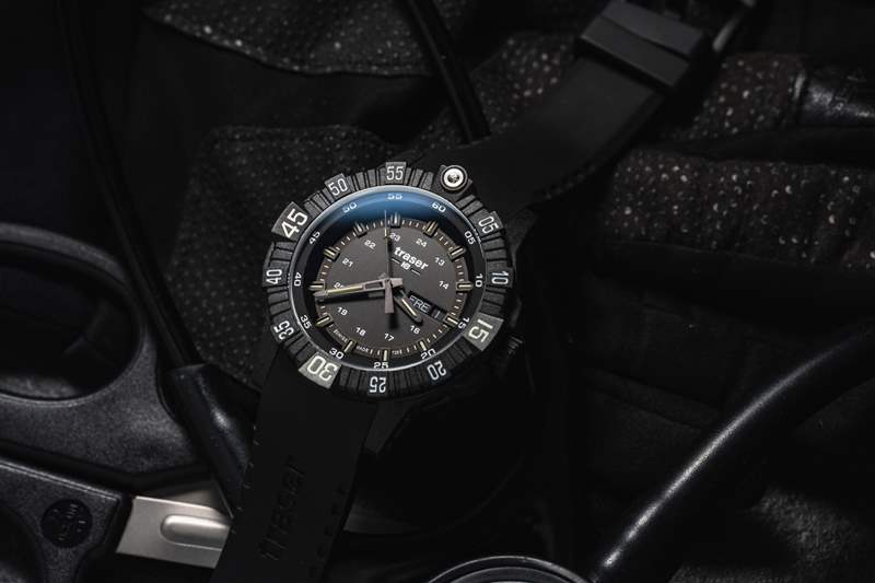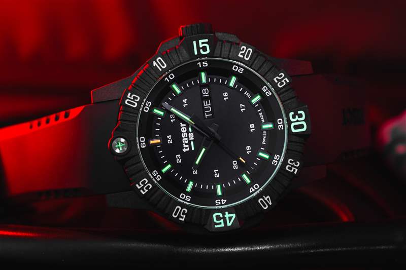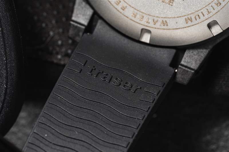 Traser P99 Q Tactical 是一款不小的手表,但戴在我 6.5 英寸的手腕上并不笨重(如上圖所示)。盡管尺寸較大,但混合表殼結(jié)構(gòu)和黑色碳纖維強化外殼的纖薄特性使其佩戴起來異常舒適。搭配的橡膠表帶重 100 克,也使其成為其他類似尺寸手表的輕巧替代品。這種較大的尺寸還可以防止它滑到襯衫或夾克的袖口下面,與大多數(shù)手表相反,這在緊急醫(yī)療領(lǐng)域是首選。在大多數(shù)情況下,戴著臟手套將袖帶向后滑動來檢查時間并不理想。然而,帶有棱紋的表圈很容易被任何類型或任何污垢量的手套抓住。雙向 60 次點擊邊框是一個令人愉悅的功能補充。雖然傳統(tǒng)的潛水表圈是單向的,但現(xiàn)場使用設(shè)備的多功能性和適應(yīng)性受到贊賞。如果我要改變邊框的一件事,那就是可以選擇更換其他刻度以滿足任務(wù)要求。