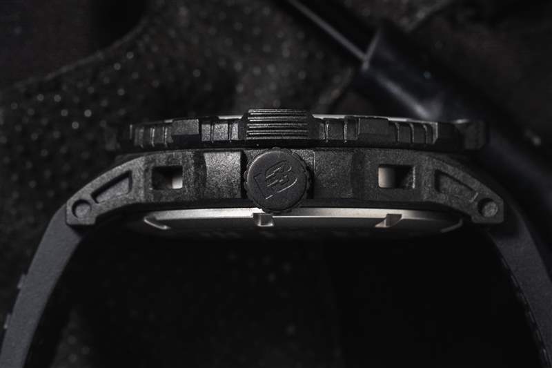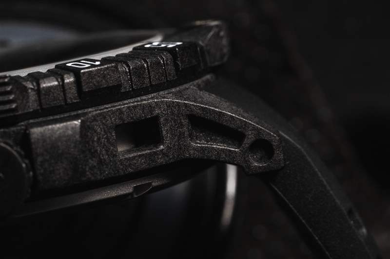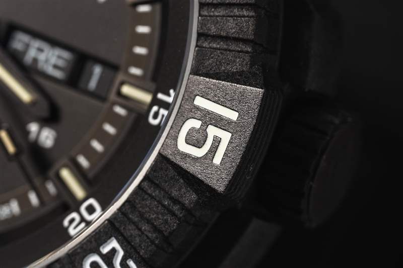 在腕表的尺寸、重量和耐用性之間尋找平衡幾乎總是取決于材料。通常,鈦是首選金屬,但它并不是唯一的功能性金屬。Traser 在 P99Q Tactical 上選擇了混合外殼結(jié)構(gòu),以彌補尺寸和重量之間的差距。表殼的外殼由碳纖維增強聚合物制成。中殼和表耳的部分經(jīng)過鏤空處理,與碳纖維增強材料的細粒效果相結(jié)合,賦予外觀動感的外觀。表殼內(nèi)部是一個鋼質(zhì)容器,里面裝有機芯和表盤。兩部分結(jié)構(gòu)形成一個大型整體封裝,直徑為 46 毫米,凸耳到凸耳之間為 53 毫米,厚度為 13.7 毫米。配備 8 毫米旋入式表冠、實心精鋼底蓋和藍寶石水晶玻璃,